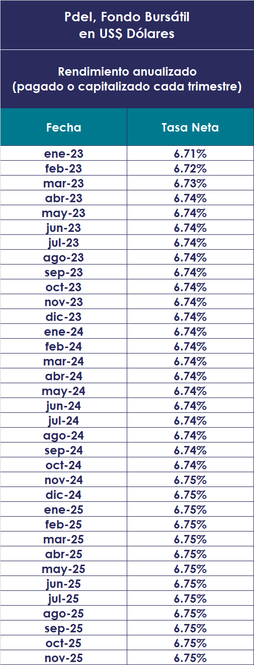 Portafolio de Inversiones, S.A., por servicios de administración que provee a PdeI Fondo Bursátil en Dólares, cobrará una remuneración de 0.75% anual más IVA, el cual se calcula diariamente sobre el valor diario del Fondo. Este se debita y cobra al inversionista cada fin de trimestre, acreditando a su cuenta el rendimiento neto. La factura que se genere por el cobro de esta remuneración, se emitirá en quetzales y se adjuntará al estado de cuenta trimestral utilizando el tipo de cambio vigente a la fecha de emisión.