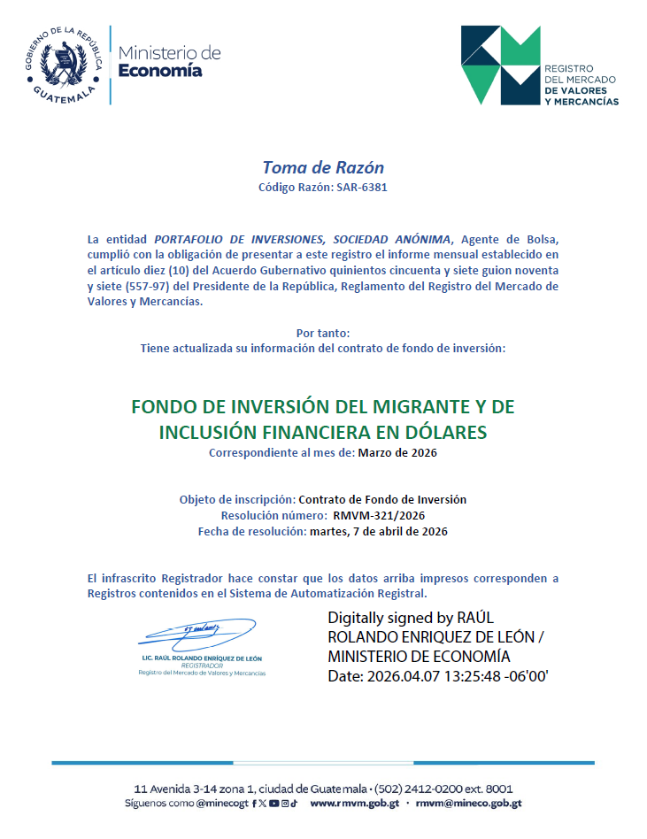 Portafolio de Inversiones, S.A. es el Agente Administrador del Fondo de Inversión del Migrante y de Inclusión Financiera en Dólares, quien cuenta con muchos años de experiencia bursátil y con más de veinticinco años de experiencia en la administración de Contratos de Fondos de Inversión, además de ser Miembro Fundador de la Bolsa de Valores Nacional, S.A.