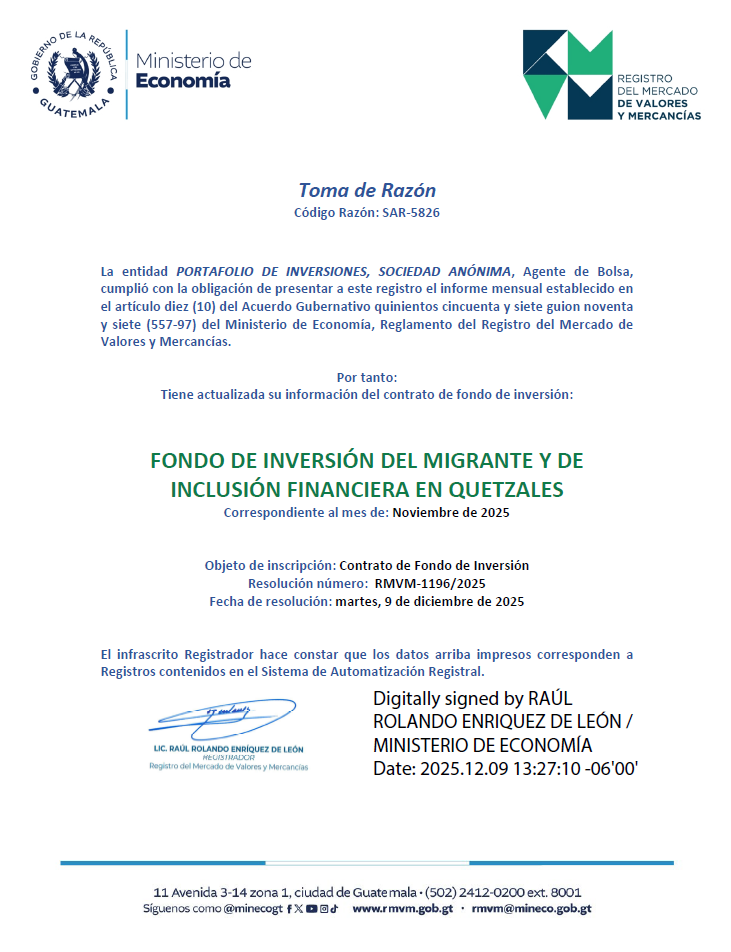 Portafolio de Inversiones, S.A. es el Agente Administrador del Fondo de Inversión del Migrante y de Inclusión Financiera en Quetzales, quien cuenta con muchos años de experiencia bursátil y con más de veinticinco años de experiencia en la administración de Contratos de Fondos de Inversión, además de ser Miembro Fundador de la Bolsa de Valores Nacional, S.A.