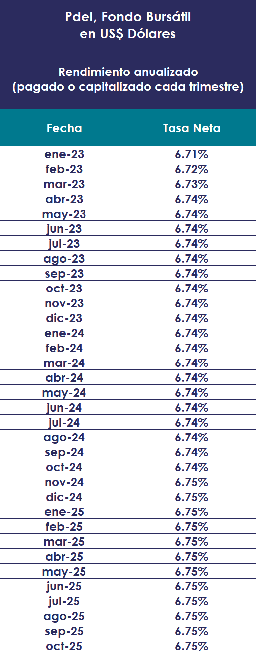 Rendimientos: | Variables, dependen del rendimiento neto del total de la cartera. Pueden ser capitalizados o retirados trimestralmente. |