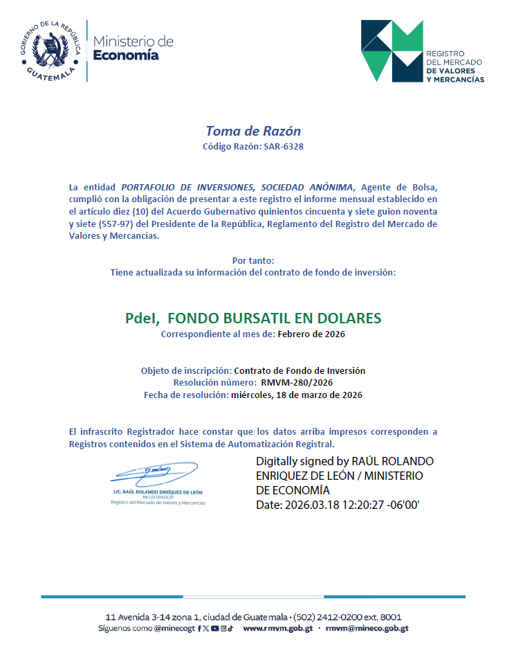 Portafolio de Inversiones, S.A. es el Agente Administrador de PdeI Fondo Bursátil en Dólares, quien cuenta con muchos años de experiencia bursátil, además de ser Miembro Fundador de la Bolsa de Valores Nacional, S.A.