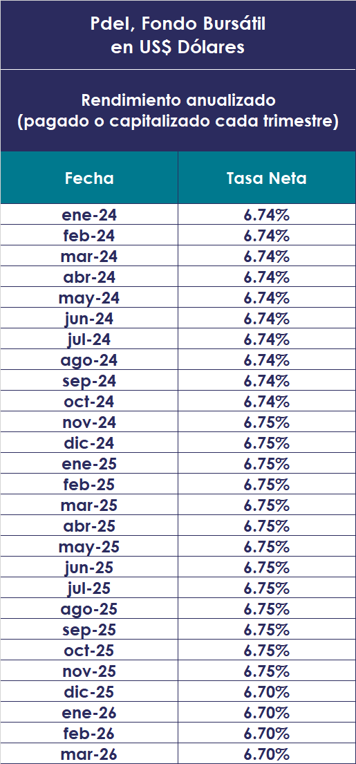 Portafolio de Inversiones, S.A., por servicios de administración que provee a PdeI Fondo Bursátil en Dólares, cobrará una remuneración de 0.75% anual más IVA, el cual se calcula diariamente sobre el valor diario del Fondo. Este se debita y cobra al inversionista cada fin de trimestre, acreditando a su cuenta el rendimiento neto. La factura que se genere por el cobro de esta remuneración, se emitirá en quetzales y se adjuntará al estado de cuenta trimestral utilizando el tipo de cambio vigente a la fecha de emisión.