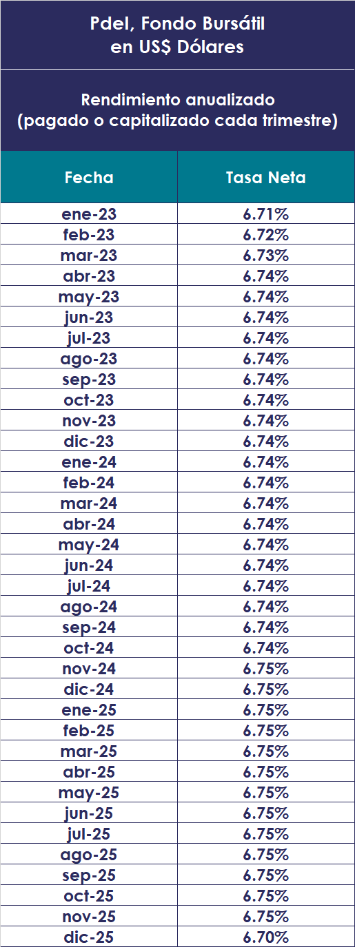 Portafolio de Inversiones, S.A., por servicios de administración que provee a PdeI Fondo Bursátil en Dólares, cobrará una remuneración de 0.75% anual más IVA, el cual se calcula diariamente sobre el valor diario del Fondo. Este se debita y cobra al inversionista cada fin de trimestre, acreditando a su cuenta el rendimiento neto. La factura que se genere por el cobro de esta remuneración, se emitirá en quetzales y se adjuntará al estado de cuenta trimestral utilizando el tipo de cambio vigente a la fecha de emisión.