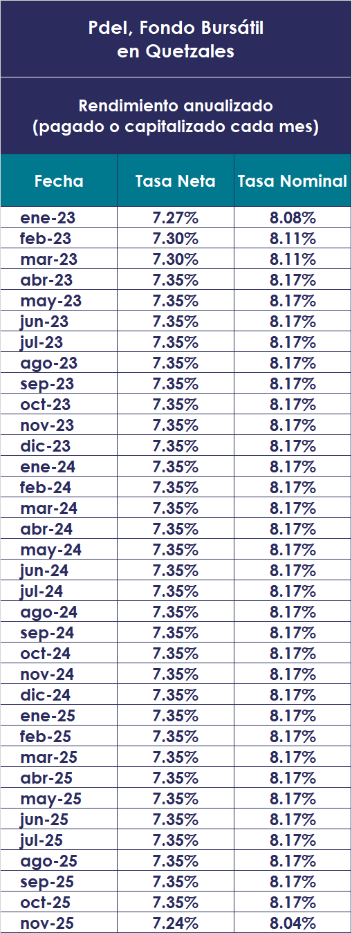 Adicionalmente, a partir de 1,999 se empieza a operar PdeI, Fondo de Valores del Estado y PdeI, Fondo Bursátil en Dólares, y a partir del 2008 se empieza a administrar PdeI, Fondo Liquido en Quetzales. Los activos administrados en estos contratos de Fondos de Inversión suman a la feha mas de mil setecientos millones de quetzales (Q.1,700,000.00)