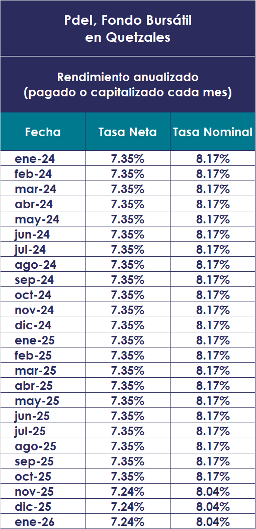 Inversión mínima inicial: | Q 10,000.00 y las subsecuentes pueden ser de cualquier cantidad. |