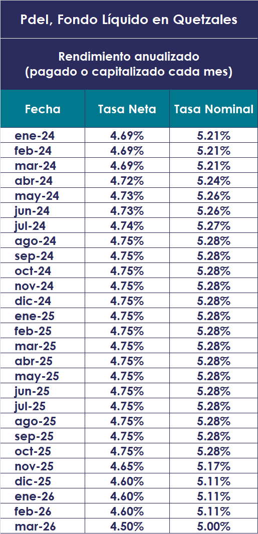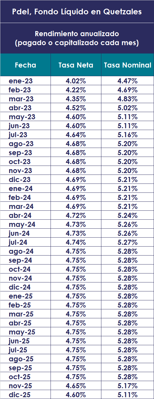 El objetivo del Fondo es maximizar el valor de todas las inversiones recibidas de los inversionistas, a través de la administración de una cartera de inversiones conformada principalmente por inversiones en títulos valores de alta liquidez o disponibilidad inmediata. El rendimiento total se espera que sea superior versus alternativas de inversión provenientes de cuentas bancarias de depósitos monetarios o a la vista. PdeI, Fondo Líquido en Quetzales brindará a sus propietarios un rendimiento proveniente, principalmente, de los intereses recibidos por las inversiones en títulos valores líquidos realizadas por el Fondo. No existe garantía alguna de alcanzar la realización de este objetivo.