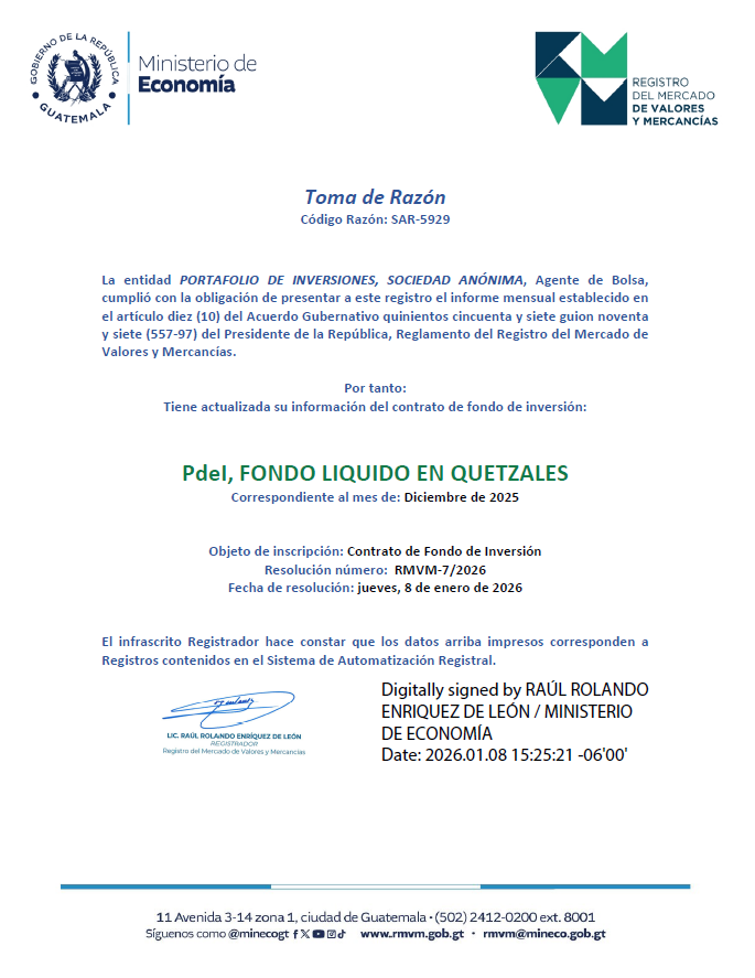 PdeI, Fondo Líquido en Quetzales es un instrumento que permite al inversionista acceder al mercado financiero y administrar su disponibilidad dineraria en las condiciones más favorables y en el largo plazo se convierte en una herramienta de crecimiento de su patrimonio.